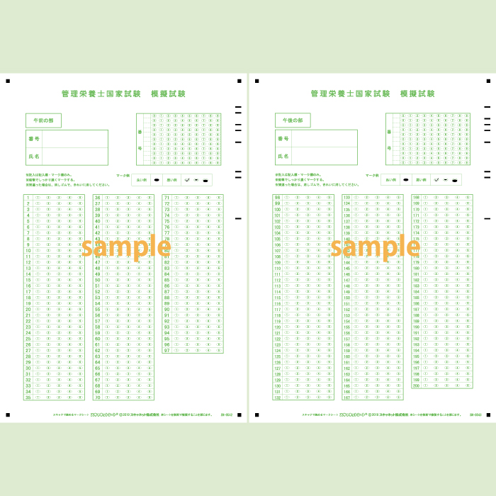 管理栄養士国家試験に対応したマークシートです。午前500枚、午後500枚。 午前の部:97問 午後の部:103問 ※「SN-P005 管理栄養士国家試験シート[午前・午後/500枚・500枚]」とまぜてお使いいただく事は出来ません