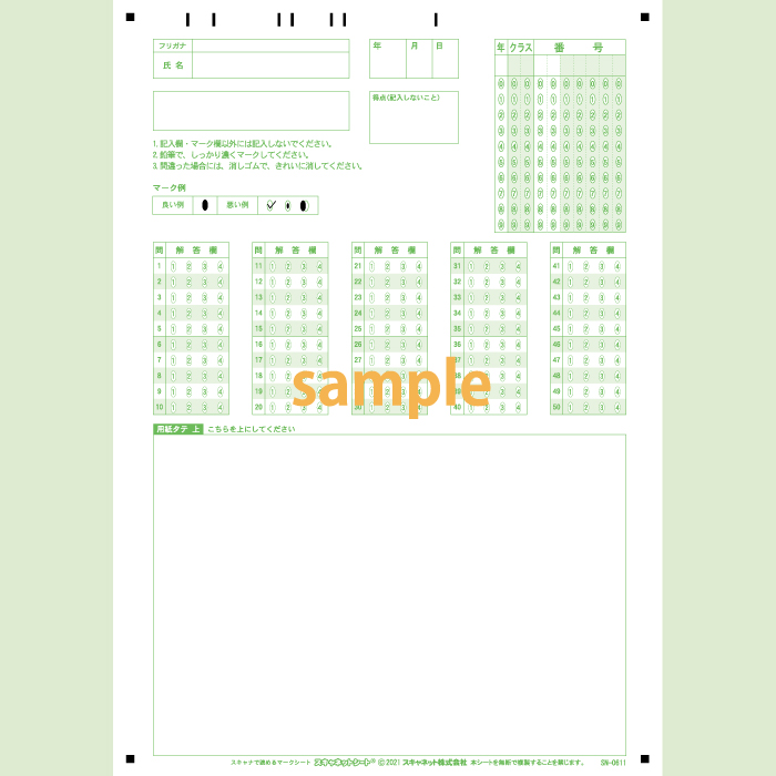 マーク・記述混在シートです。 A4サイズで上部がマーク問題、下部が記述問題を実施できます。 マーク問題と記述式問題の両方の実施と採点が行えます。