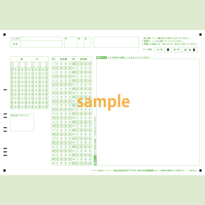 マーク・記述混在シートです。 A4サイズで左側がマーク問題、右側が記述問題を実施できます。 マーク問題と記述式問題の両方の実施と採点が行えます。