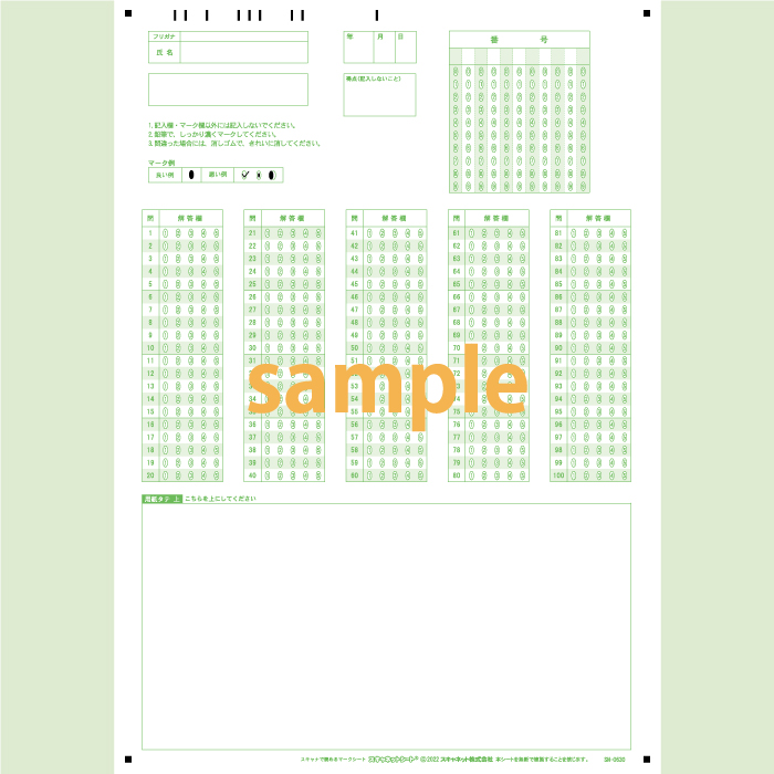 マーク・記述混在シートです。 B4サイズで上部がマーク問題、下部が記述問題を実施できます。 マーク問題と記述式問題の両方の実施と採点が行えます。