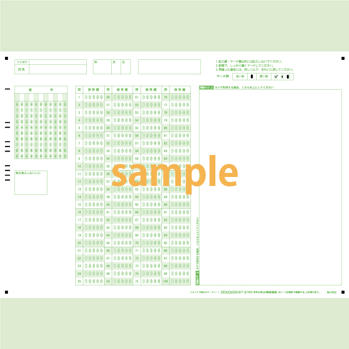 マーク・記述混在シートです。 B4サイズで左側がマーク問題、右側が記述問題を実施できます。 マーク問題と記述式問題の両方の実施と採点が行えます。