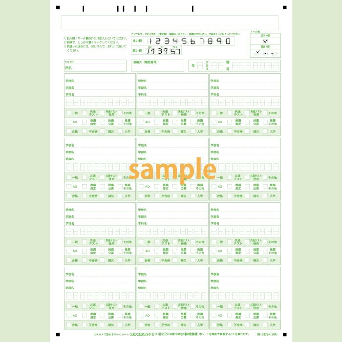 デジタル数字で記入できる進路調査用シートです。 1枚の用紙に12校の進路希望校を記入できます。 詳細な受験方法・受験結果のチェック項目を設けており、データはエクセル・CSVファイルに出力いただけます。 出力いただいたデータは、予備校の進路調査等にご活用いただけます。