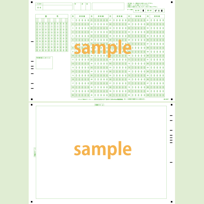 マーク・記述混在シートです。 A4サイズ両面で表面がマーク問題、裏面が記述問題を実施できます。 マーク問題と記述式問題の両方の実施と採点が行えます。