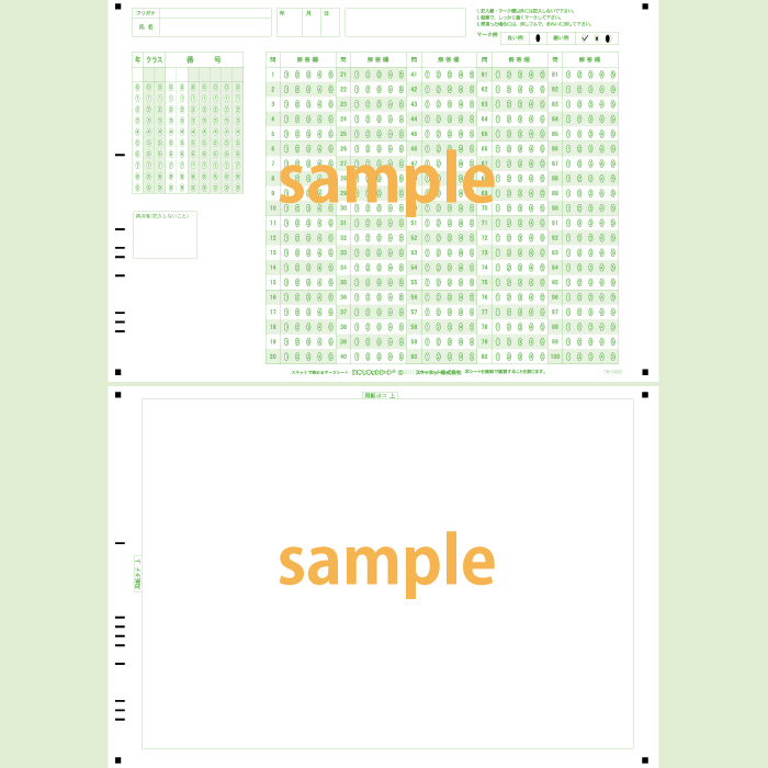 マーク・記述混在シートです。 A4サイズ両面で表面がマーク問題、裏面が記述問題を実施できます。 マーク問題と記述式問題の両方の実施と採点が行えます。