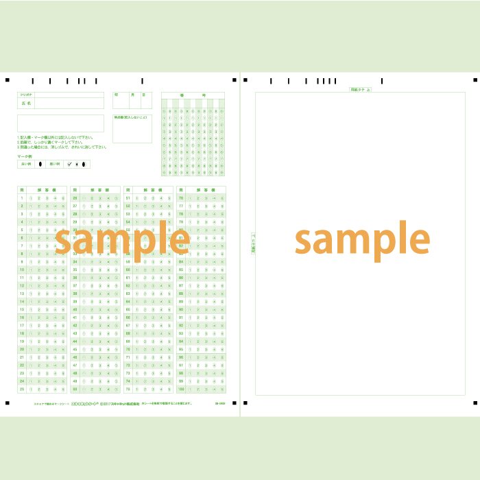 マーク・記述混在シートです。 A4サイズ両面で表面がマーク問題、裏面が記述問題を実施できます。 マーク問題と記述式問題の両方の実施と採点が行えます。