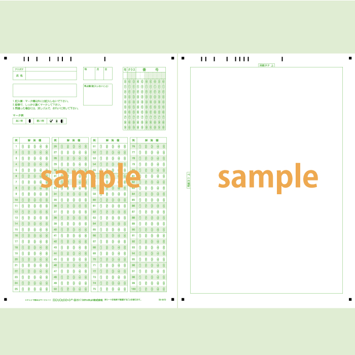 マーク・記述混在シートです。 A4サイズ両面で表面がマーク問題、裏面が記述問題を実施できます。 マーク問題と記述式問題の両方の実施と採点が行えます。