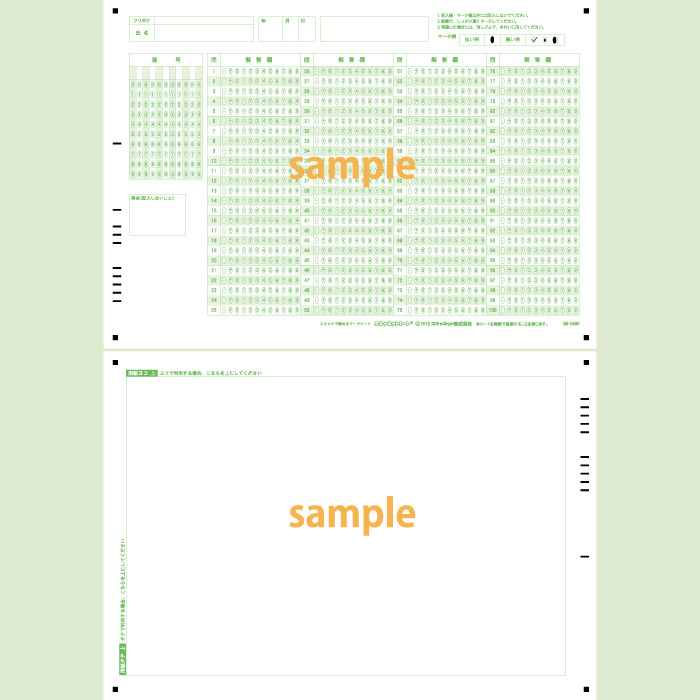 マーク・記述混在シートです。 A4サイズ両面で表面がマーク問題、裏面が記述問題を実施できます。 マーク問題と記述式問題の両方の実施と採点が行えます。